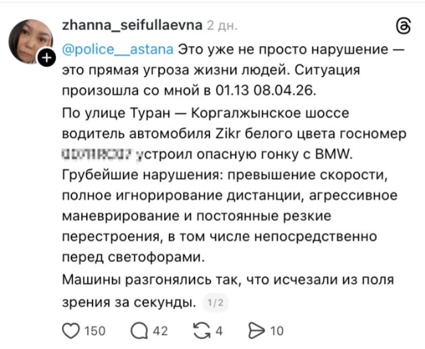 “Это уже не просто нарушение — это прямая угроза жизни людей”, — с такими словами обратилась жительница столицы после ночного инцидента на одной из оживленных магистралей, передает Liter.kz.