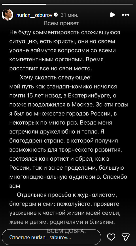 Стендапер Нурлан Сабуров после сообщений в СМИ о запрете его въезда в Россию на 50 лет сделал официальное заявление в социальных сетях, передает Liter.kz.