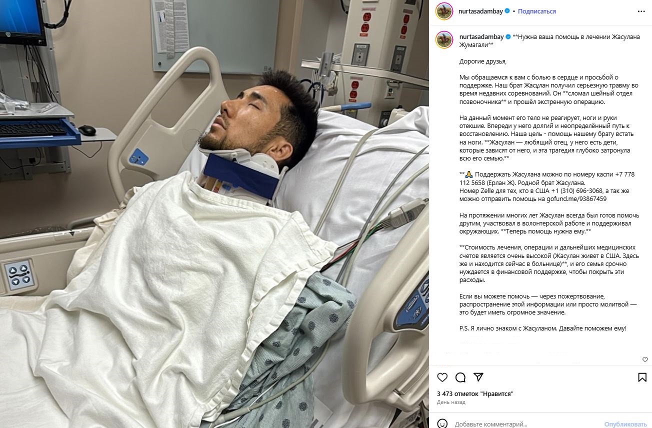 “На данный момент его тело не реагирует, ноги и руки отекшие. Впереди у него долгий и неопределенный путь к восстановлению. Наша цель – помощь нашему брату встать на ноги. Жасулан любящий отец, у него есть дети, которые зависят от него, и эта трагедия глубоко затронула всю его семью”, – написал шоумен.