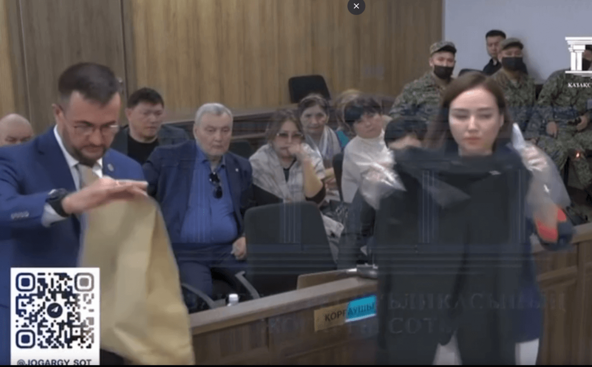 Адвокаты потерпевшей стороны продемонстрировали брюки Нукеновой и пояснили, что зауженный фасон брючин не позволил бы снять брюки через ботинки. Ранее подсудимый Бишимбаев говорил, что он снимал одежду с Салтанат Нукеновой как раз через обувь.