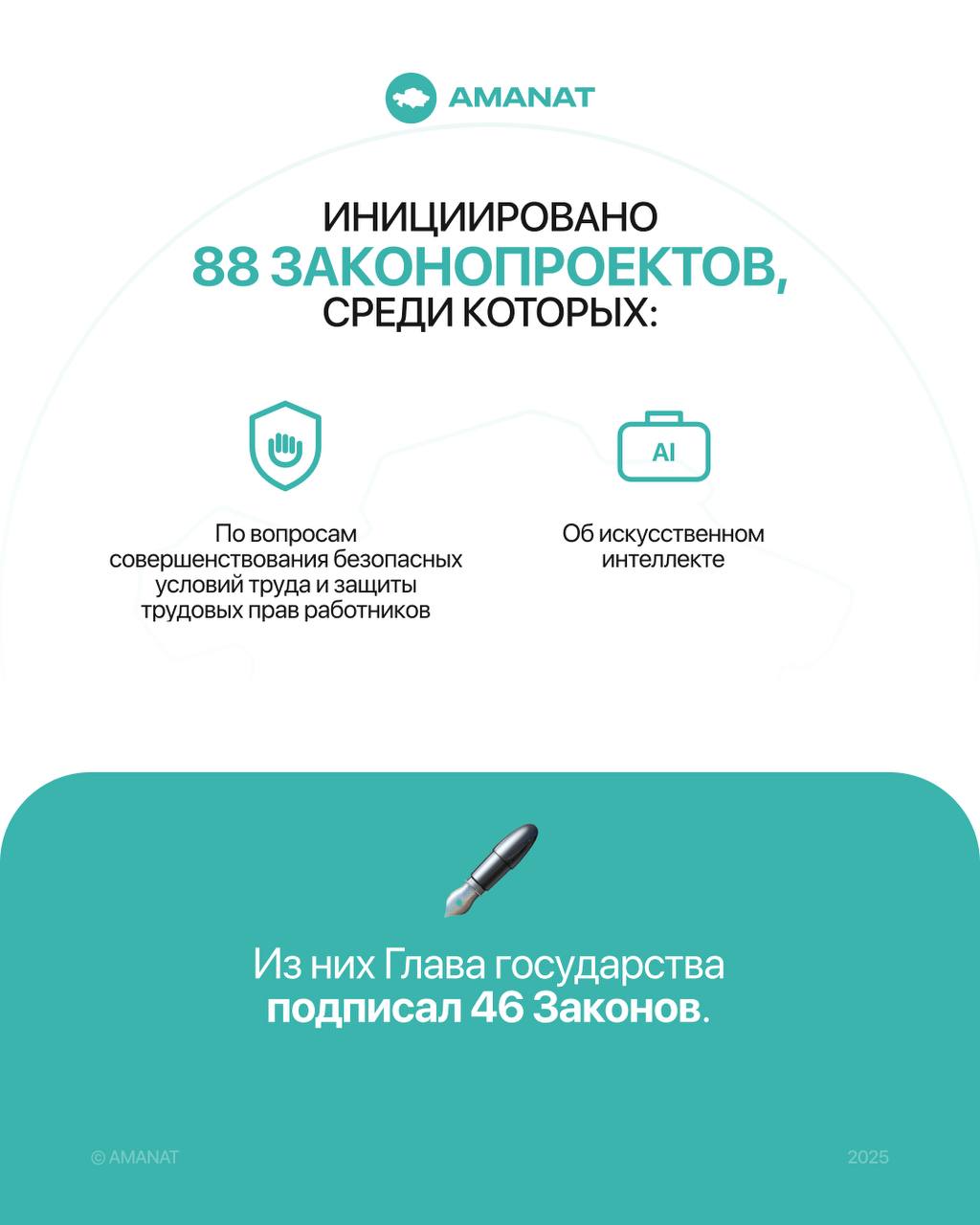 С начала VIII созыва депутаты – члены фракции AMANAT инициировали 88 законопроектов, охватывающих практически все ключевые сферы жизни страны. 46 законов уже подписаны главой государства, часть принята и направлена в Сенат, еще 35 находятся в активной работе Мажилиса, передает Liter.kz.