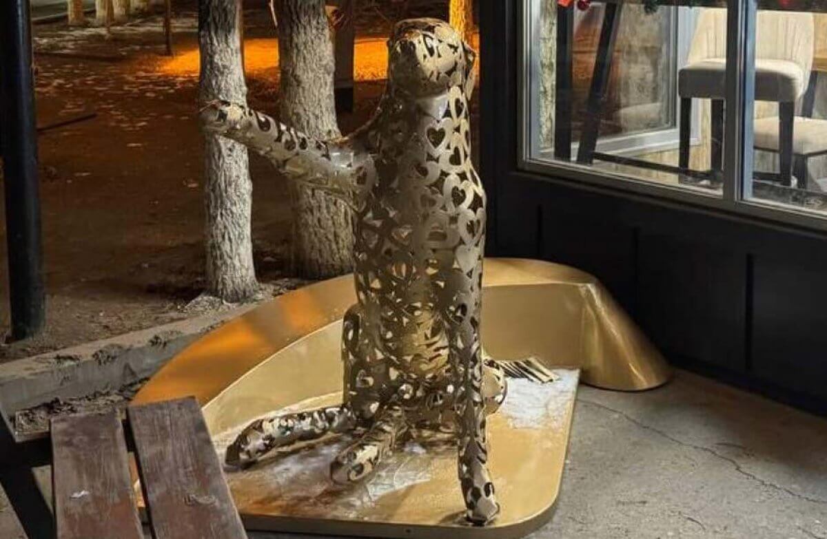 Скульптура, выполненная из черного металла, установлена перед одной из кофейней города на набережной, передает Liter.kz.