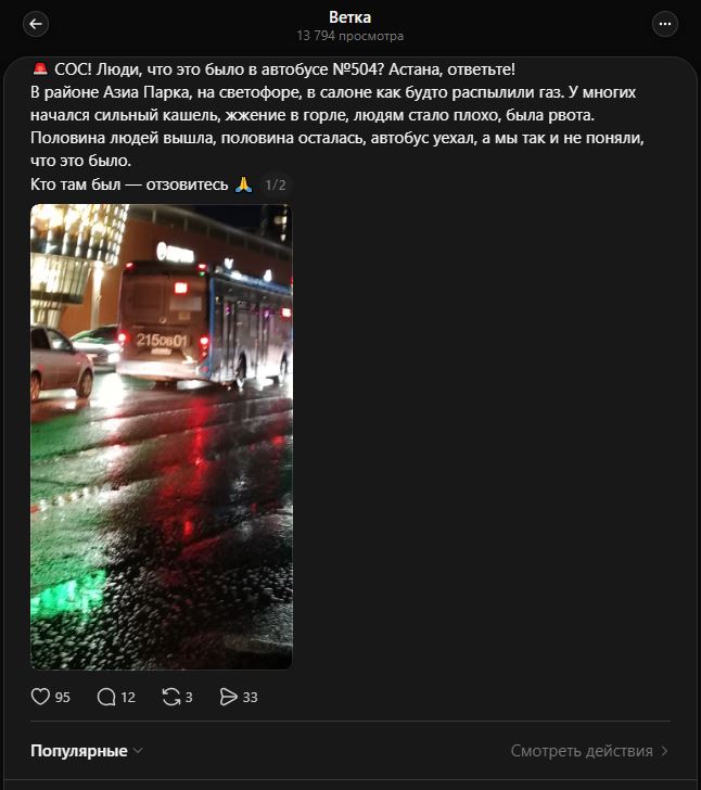 В Астане проводится проверка после инцидента в городском автобусе № 504, где пассажирка пожаловалась на резкое ухудшение самочувствия и возможное распыление неизвестного вещества в салоне, передает Liter.kz.