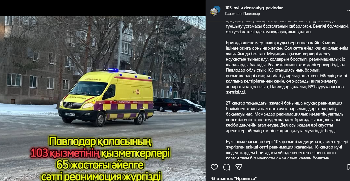 Экстренный вызов на пульт скорой помощи поступил 25 января. Бригада прибыла на место в течение трех минут. Медики немедленно освободили дыхательные пути пациентки и провели реанимационные мероприятия. После стабилизации ее подключили к аппарату искусственной вентиляции легких и доставили в городскую больницу № 1 Павлодара.