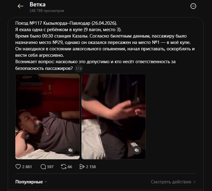 В соцсети Threads появилась публикация казахстанки, которая рассказала о конфликтной ситуации во время поездки на поезде Кызылорда – Павлодар. Инцидент, по ее словам, произошел 26 апреля 2026 года в 9-м вагоне поезда № 117, передает Liter.kz.