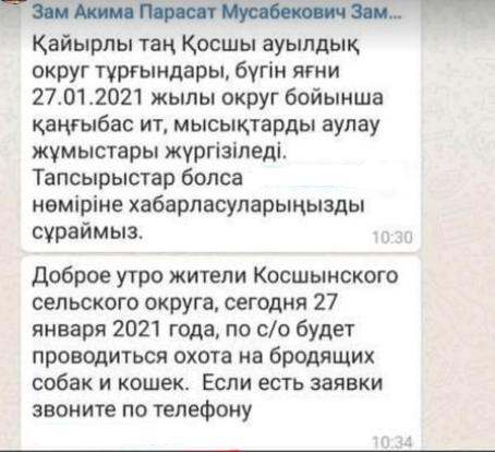 27 января 2021 года жители села Косшы пришло сообщение с анонсом "охоты" на бродящих собак и кошек. Фото этого сообщения попало к волонтерам, которые сразу же подняли шум в соцсетях.