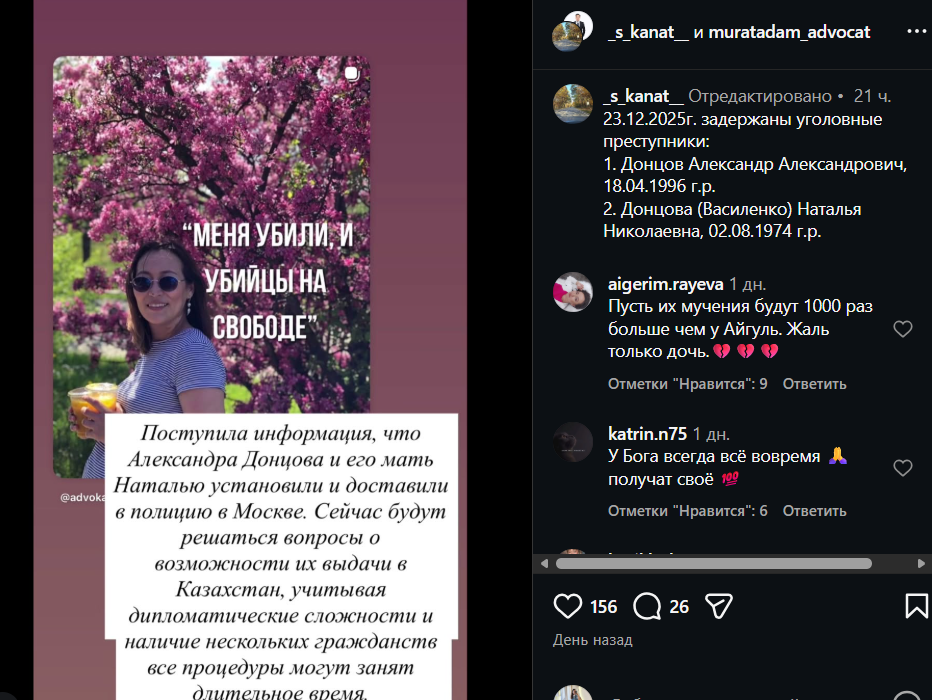 “Поступила информация, что Александра Донцова и его мать Наталью установили и доставили в полицию в Москве. Сейчас будут решаться вопросы о возможности их выдачи в Казахстан, учитывая дипломатические сложности и наличие нескольких гражданств, все процедуры могут занят длительное время”.