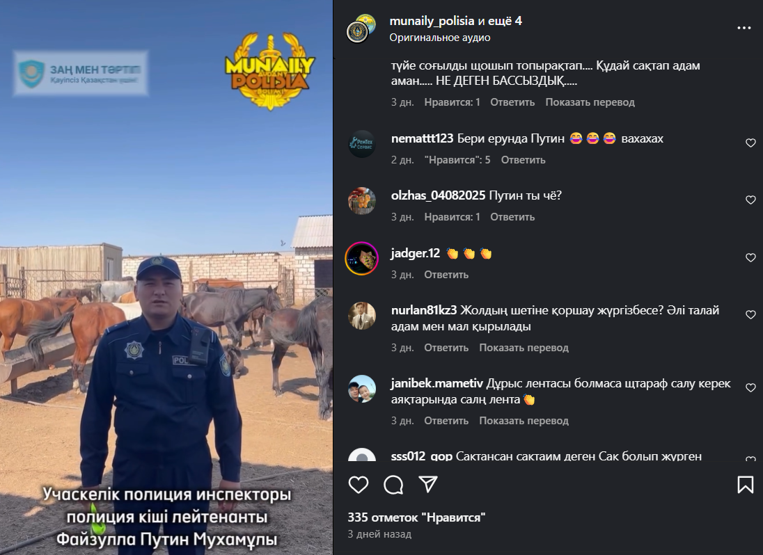 Полицейский по имени Путин стал звездой соцсетей в Мангистау