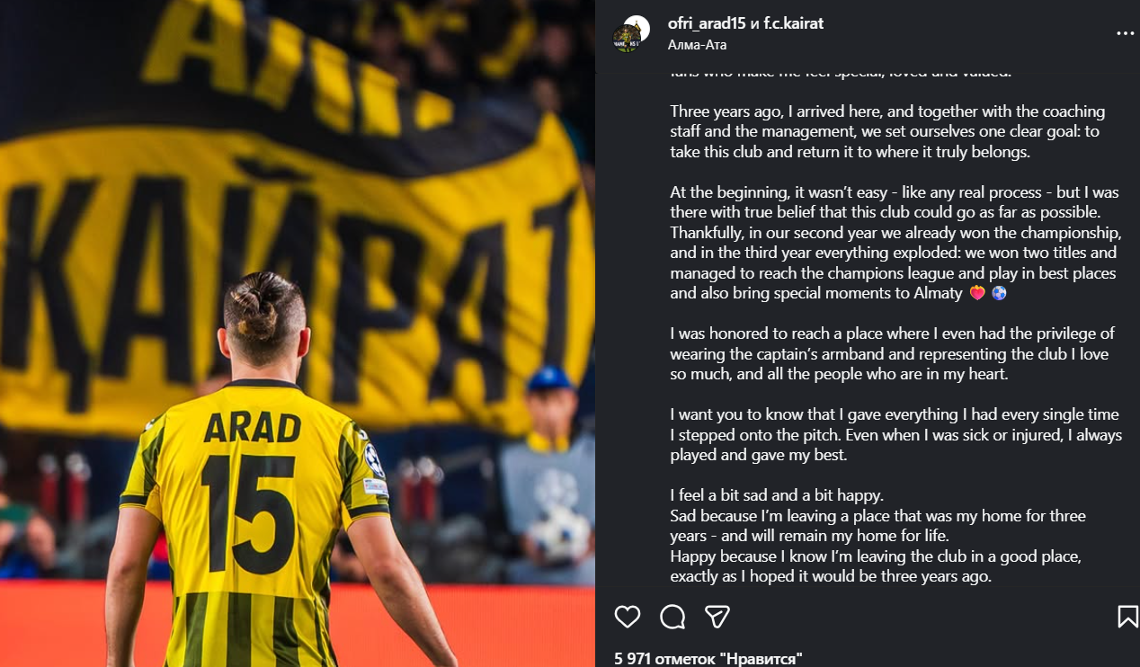 Израильский полузащитник Офри Арад официально попрощался с болельщиками алматинского “Кайрата” через свою страницу в соцсетях, передает Liter.kz.