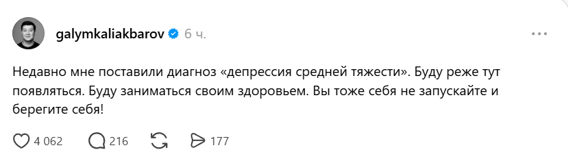 "Недавно мне поставили диагноз "депрессия средней тяжести". Буду реже тут появляться. Буду заниматься своим здоровьем. Вы тоже не запускайте и берегите себя!" - написал Галым Калиакбаров на своей странице в Threads.