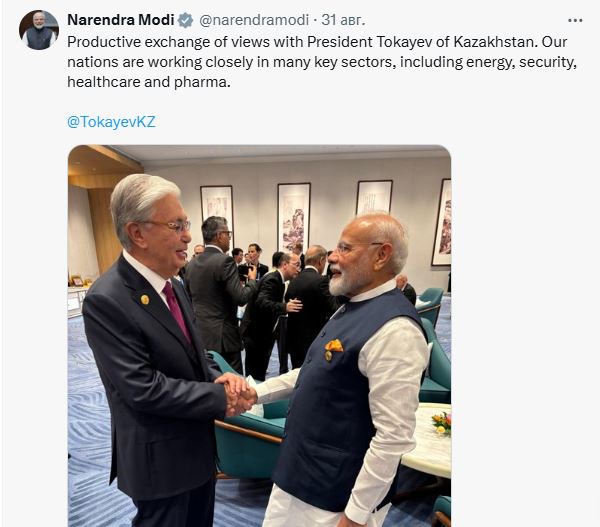 “Продуктивный обмен мнениями с президентом Казахстана Токаевым. Наши страны тесно сотрудничают во многих ключевых секторах, включая энергетику, безопасность, здравоохранение и фармацевтику", - подписал фото Нарендра Моди.