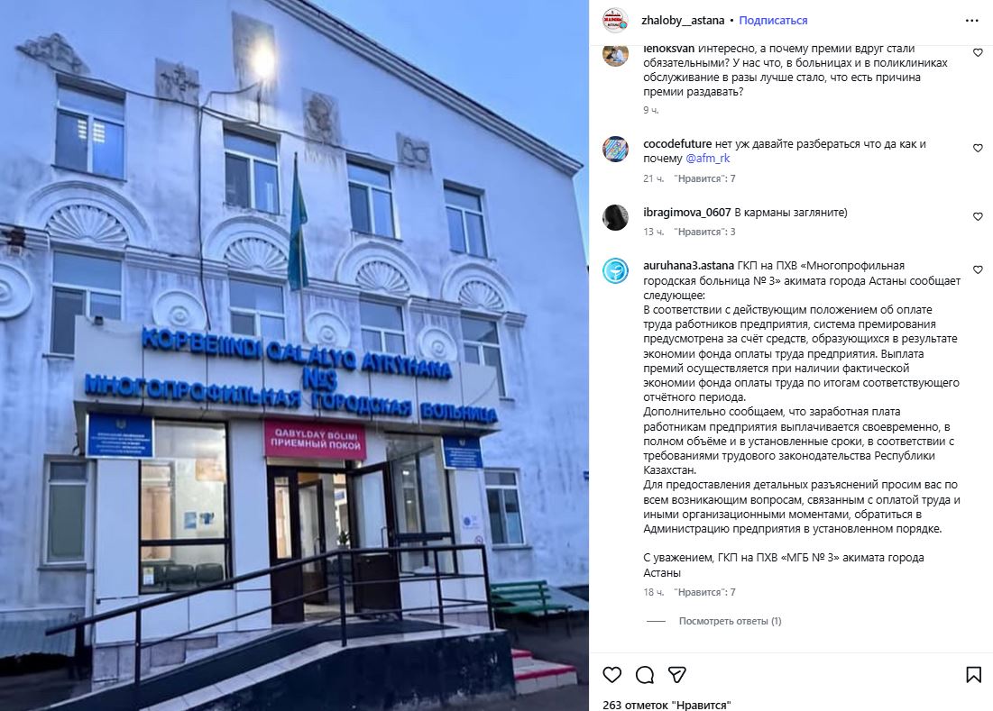Коллектив Многопрофильной городской больницы № 3 города Астаны направил жалобу с просьбой провести проверку в связи с нарушением трудовых прав. По словам сотрудников, предусмотренные системой оплаты труда премиальные выплаты не выплачиваются без объяснения причины, а соответствующие положения о премировании не разъясняются, передает Liter.kz со ссылкой на zhaloby__astana.