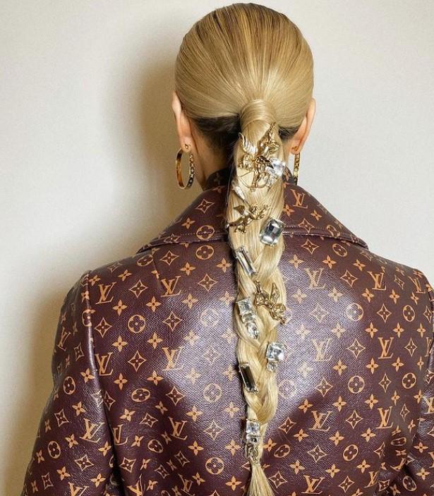 Сделайте прическу, которую носите каждый день, или завяжите гладкий низкий хвост и добавьте в волосы немного блеска. Это может быть полоска страз, пара жгутов из переливающегося дождика или декоративная гирлянда из крошечных позолоченных шариков. Закрепить украшение на волосах можно с помощью заколок‑невидимок.