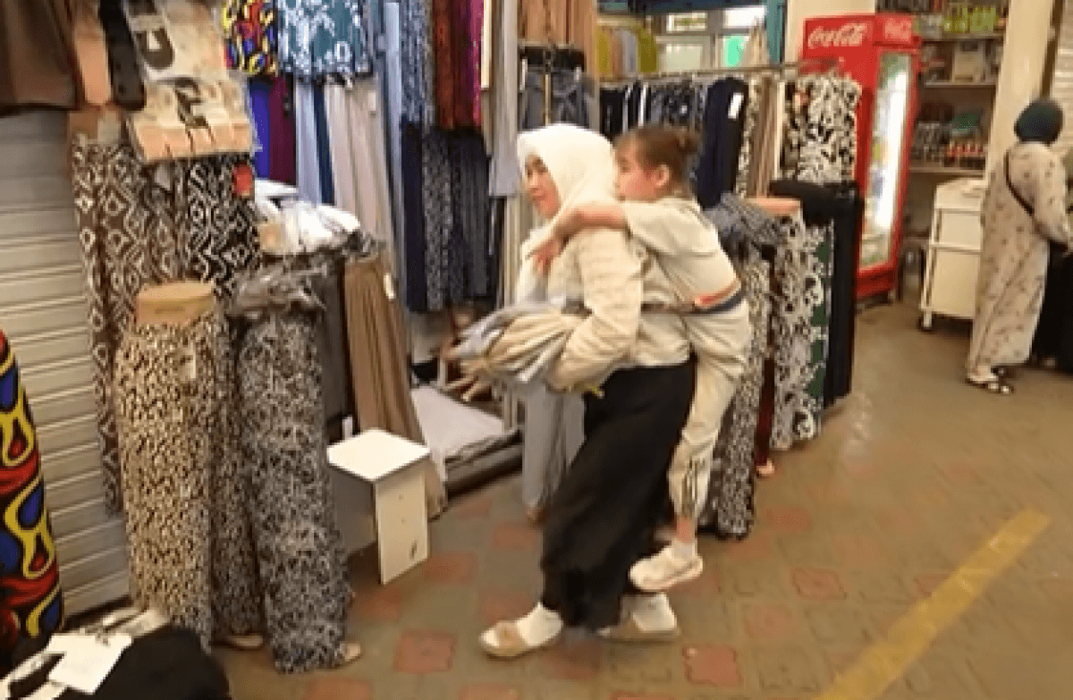 “Беру среднюю дочь с собою на работу. Привязываю ее к себе веревкой за талию. Вечером хожу мыть полы в кафе”, – говорит многодетная мать на видео.