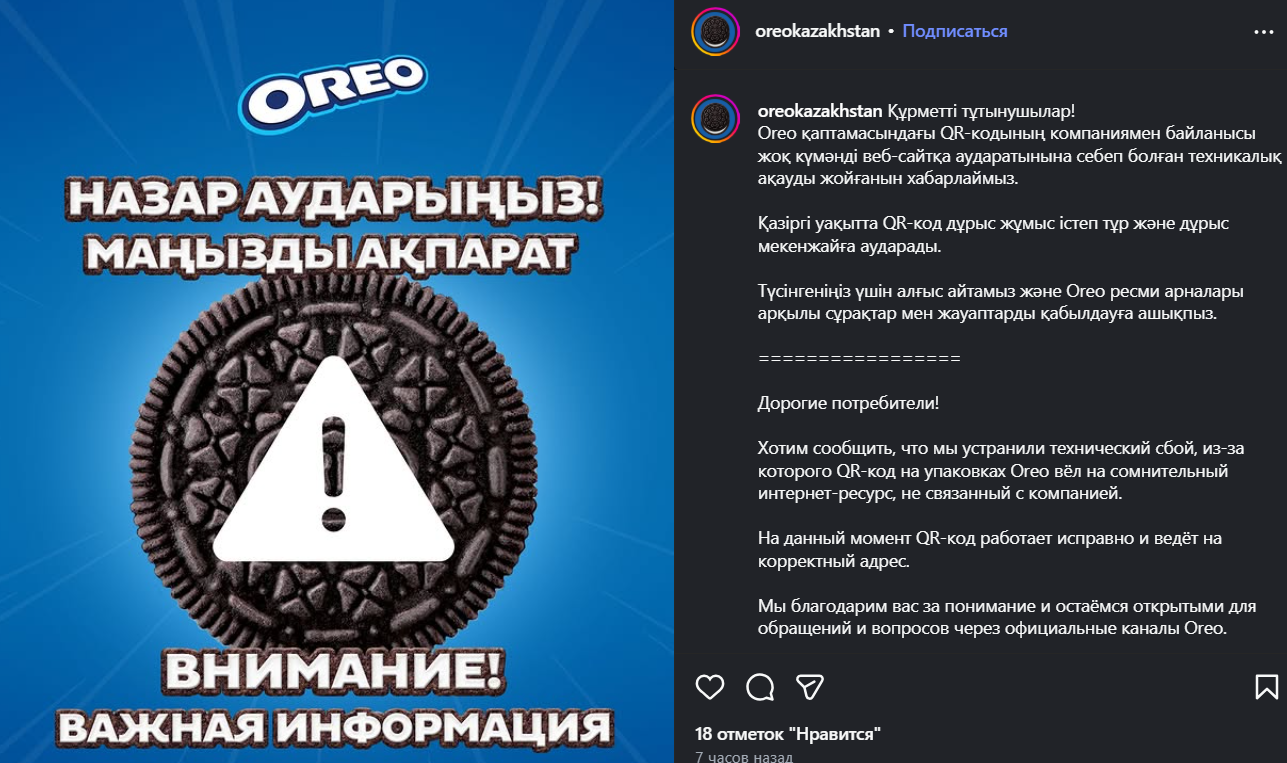 “Хотим сообщить, что мы устранили технический сбой, из-за которого QR-код на упаковках Oreo вел на сомнительный интернет-ресурс, не связанный с компанией. На данный момент QR-код работает исправно и ведет на корректный адрес”.