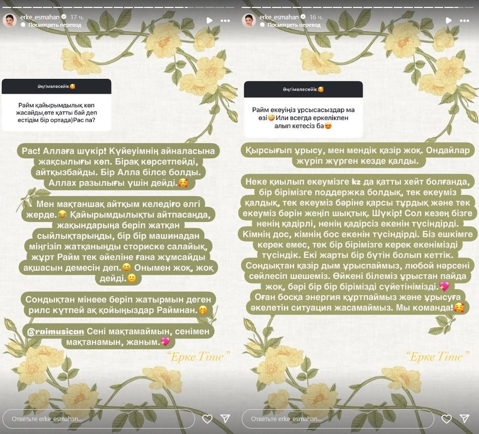 Raim помогает всем, но в stories не ждите – Ерке Есмахан о скромности мужа
