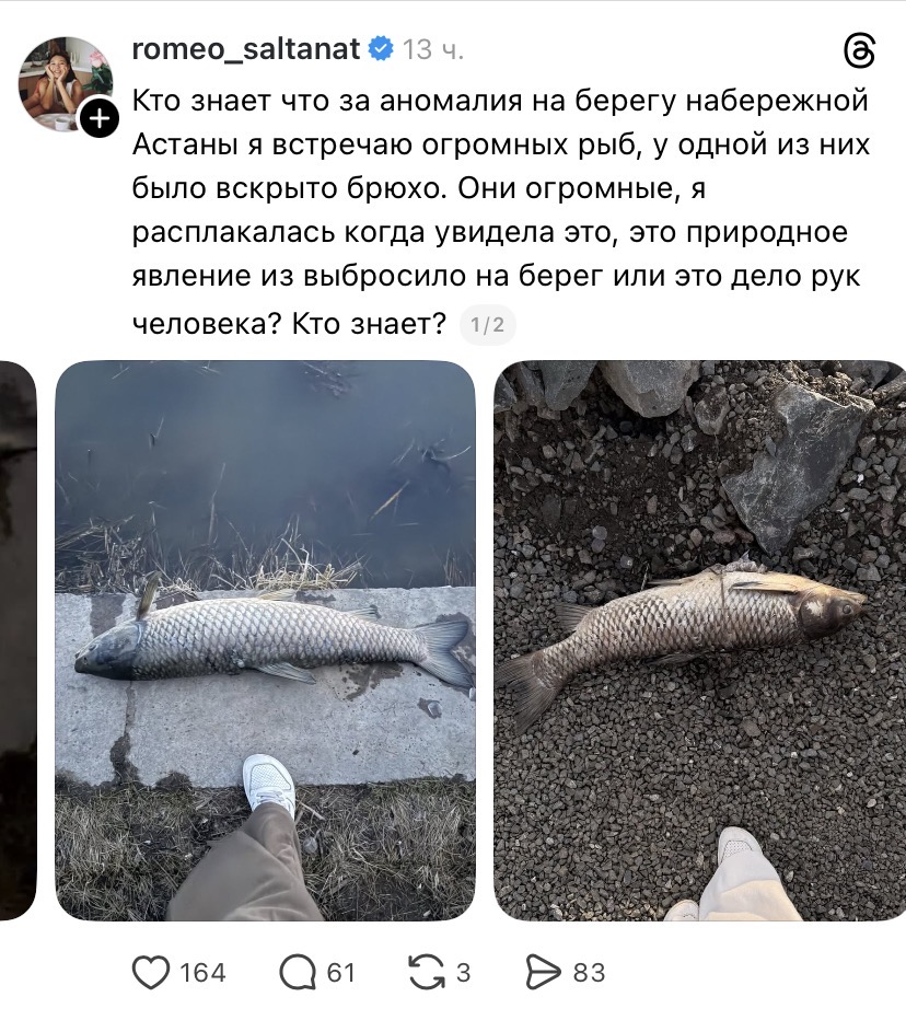Фотографии с места появились в социальной сети Threads. На кадрах видно несколько крупных особей, выброшенных на берег. У одной из рыб зафиксировано вскрытое брюхо, что особенно обеспокоило очевидцев.