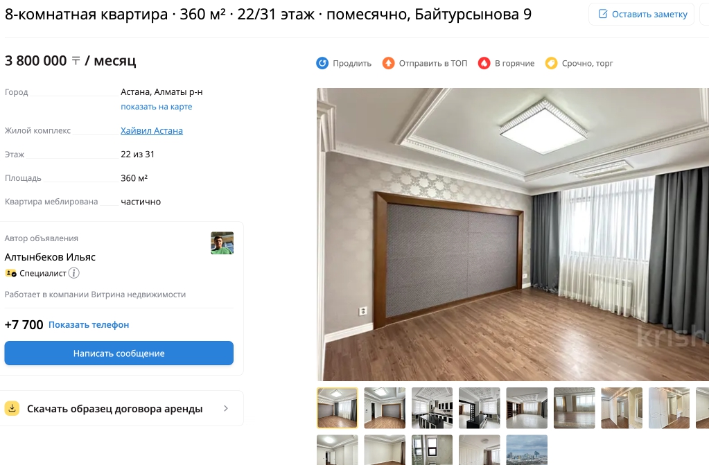 Описание: 140 кв. м, свежий ремонт, хороший вид из окна. В стоимость не входят коммунальные (около 50 тысяч тенге зимой), а хозяин требует депозит в 1 млн тенге. Арендатору запрещено держать домашних животных, а за любой "ущерб" (даже царапину на паркете) депозит не возвращается.