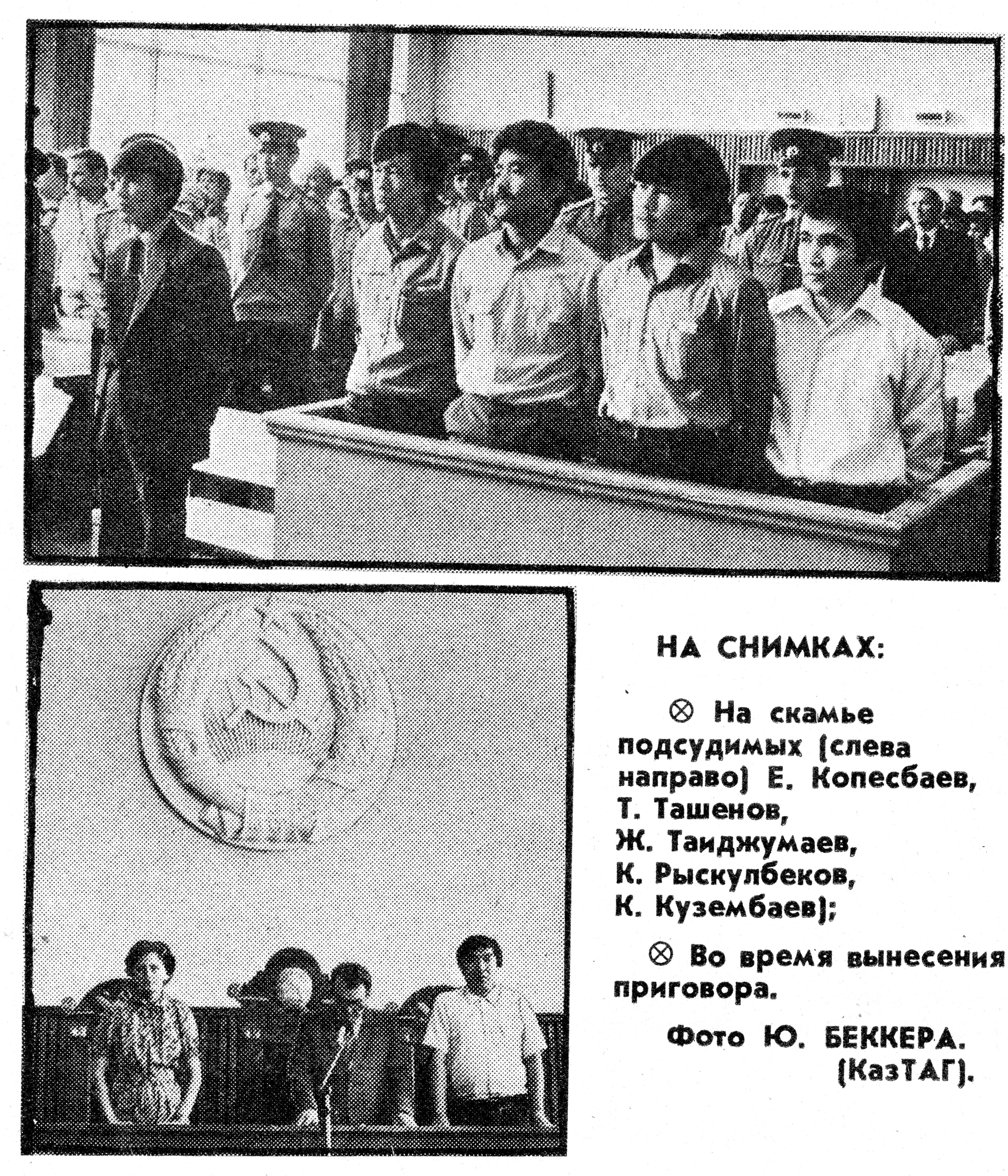 В Казахской ССР фото с судебного процесса над Кайратом Рыскулбековым и четверыми участниками декабрьских событий напечатали три газеты: “Жетісу” – на казахском языке, “Огни Алатау” – на русском и “Коммунизм туги” – на уйгурском.