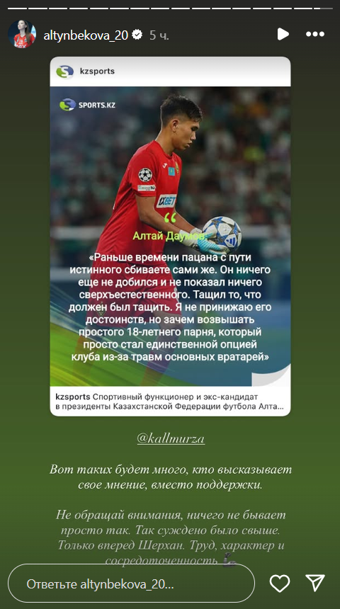 Казахстанская волейболистка Сабина Алтынбекова выразила поддержку в адрес 18-летнего вратаря футбольного клуба “Кайрат” Шерхана Калмурза, передает Liter.kz.