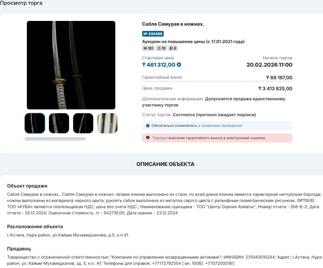 Сабля Самурая, принадлежавшая бывшему председателю КНБ Кариму Масимову, ушла с молотка за 3,4 миллиона тенге. Объект выставила на электронной торговой площадке “Компания по управлению возвращенными активами”, передает Liter.kz.