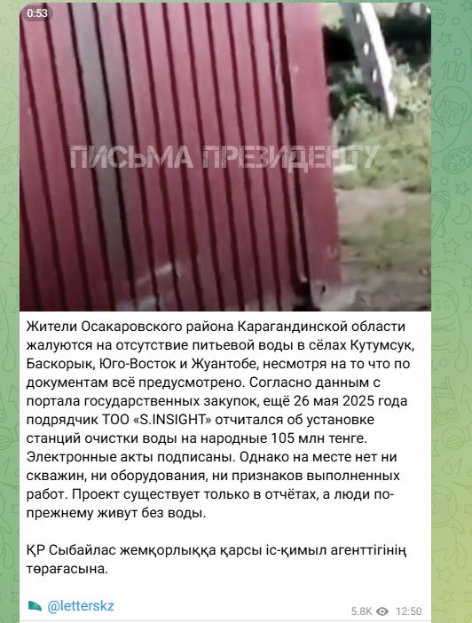 Согласно данным с портала государственных закупок, которые приводит Telegram-канал Письма президенту, 26 мая 2025 года подрядная организация отчиталась об установке станций очистки воды на сумму 105 млн тенге. Электронные акты были подписаны, однако, по словам сельчан, никаких признаков проведенных работ они не увидели. Возникли подозрения, что проект существует лишь на бумаге.