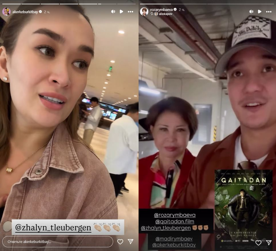 Семья посетила показ нового отечественного фильма QAITADAN. Своими впечатлениями они поделились в Instagram – Али Окапов и Акерке Буркитбай опубликовали серию stories из кинотеатра. В кадре также появилась Роза Рымбаева, которая, судя по эмоциям, осталась довольна просмотром, и ее младший сын Мади Рымбаев.