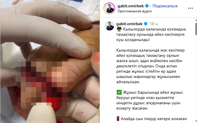 "Это не просто бытовой конфликт — это нарушение трудовых прав женщины-предпринимателя и ее конституционного права на безопасные условия труда", – объясняет адвокат Габит Умирбеков.