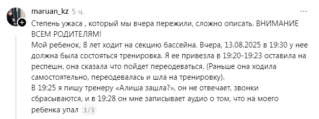 "Мой ребенок 8 лет ходит на секцию бассейна. Вчера, 13.08.2025, в 19:30 у нее должна была состояться тренировка. Я ее привезла в 19:20, в 19:23 оставила на респешн, она сказала, что пойдет переодеваться. (Раньше она ходила самостоятельно, переодевалась и шла на тренировку). В 19:25 я пишу тренеру "Алиша зашла?", он не отвечает, звонки сбрасываются, и в 19:28 он мне записывает аудиосообщение", — написала автор.