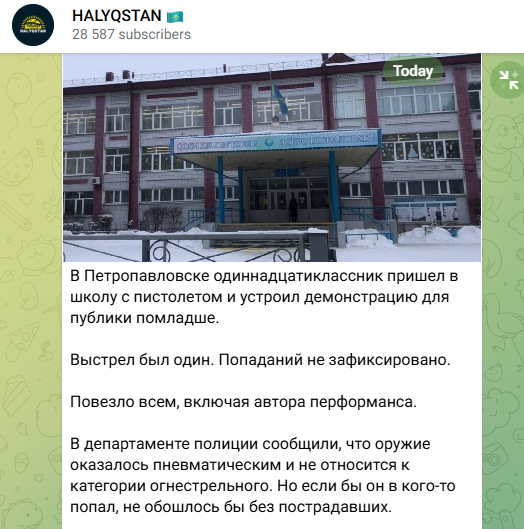 Как сообщает издание 7152.kz, инцидент произошел 5 февраля. В департаменте полиции Северо-Казахстанской области заявили, изъятый у ученика предмет оказался пневматическим пистолетом и не относится к огнестрельному оружию. В результате происшествия никто не пострадал, однако сам факт появления школьника с оружием в учебном заведении стал основанием для разбирательства.