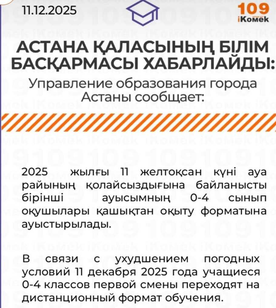 В связи с ухудшением погодных условий, 11 декабря учащиеся 0–4 классов первой смены в Астане переходят на дистанционный формат обучения, передает Liter.kz со ссылкой на акимат города.