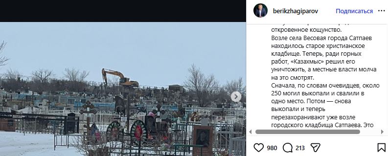 Конфликт вокруг старого христианского кладбища возле села Весовая в городе Сатпаев перерос в громкую общественную дискуссию. Поводом стало заявление общественника, который обвинил компанию “Казахмыс” и местные власти в варварском отношении к захоронениям, передает Liter.kz.