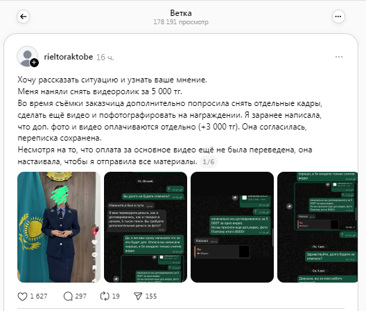 По словам девушки, ее наняли для съемки видеоролика за пять тысяч тенге. В процессе работы заказчица дополнительно попросила снять отдельные кадры, записать еще одно видео и провести фотосъемку во время награждения. Автор публикации заранее предупредила, что дополнительный контент оплачивается отдельно еще три тысячи тенге, на что получила согласие. Переписка, как утверждает девушка, у нее сохранилась.