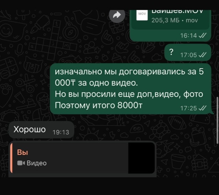 Несмотря на то, что плата за основной ролик на тот момент еще не поступила, заказчица настаивала на передаче всех материалов. Видеограф пошла навстречу и отправила фото и видео, рассчитывая на добросовестность заказчика. В итоге ей перевели лишь пять тысяч тенге за изначальный видеоролик. За дополнительную работу плата так и не поступила, а после напоминаний заказчица перестала выходить на связь.