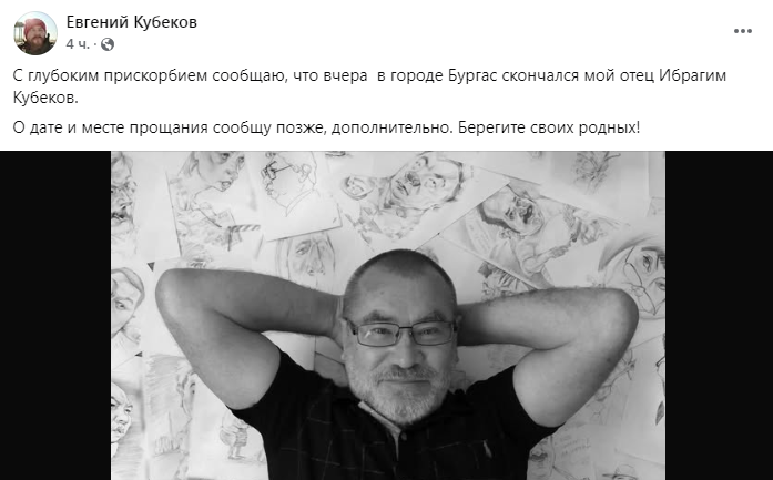 "С глубоким прискорбием сообщаю, что вчера в городе Бургас [Испания] скончался мой отец Ибрагим Кубеков. О дате и месте прощания сообщу позже, дополнительно. Берегите своих родных!" — говорится в сообщении.