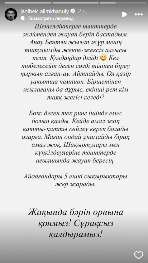 По словам Алимханулы, он начал отвечать на заявления зарубежных соперников в социальных сетях, поскольку, как считает спортсмен, вокруг его титула развернулась информационная игра без реального подтверждения в ринге.