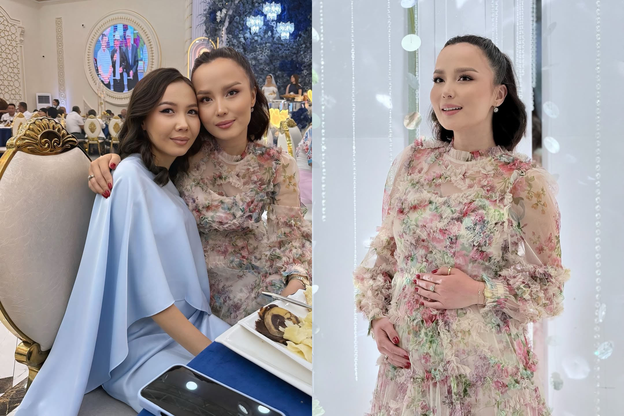 На фото Жулдыз предстала в закрытом платье с нежными розами и с заметно округлившимся животом.