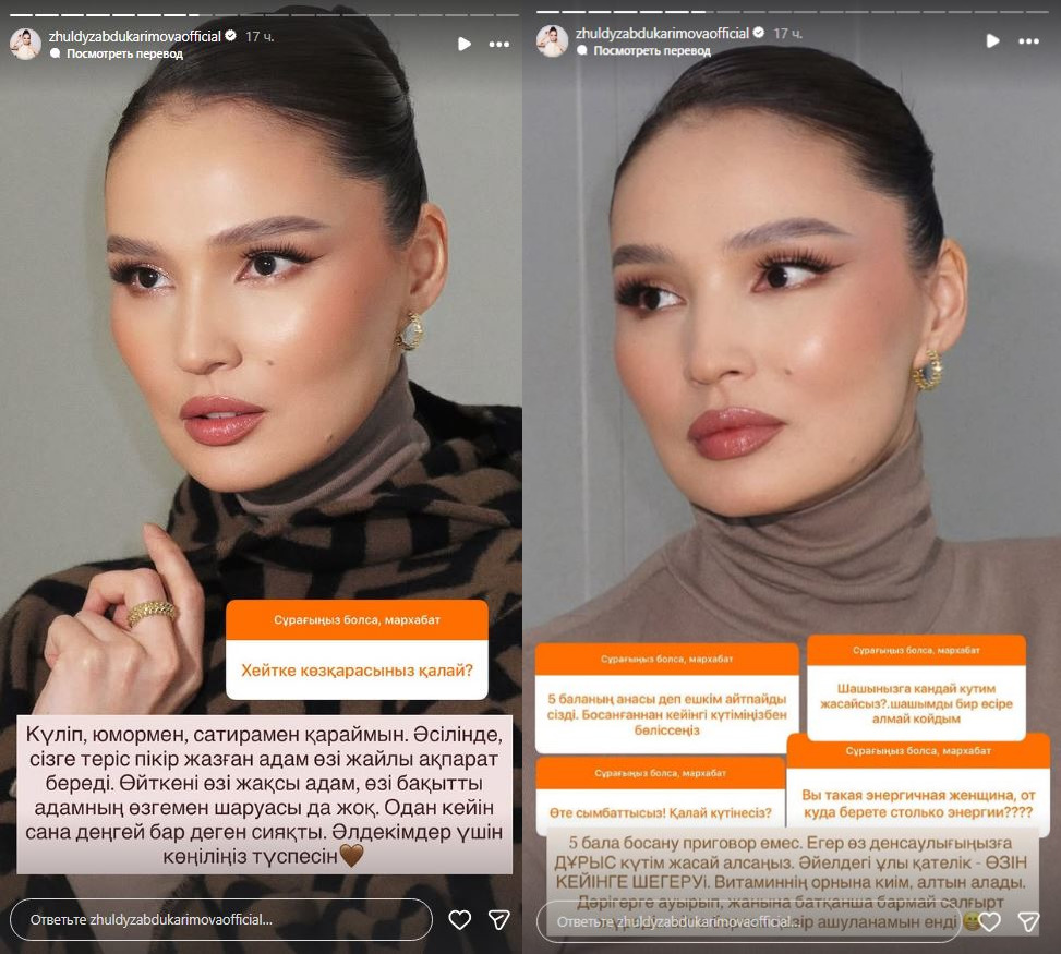 Казахстанская актриса Жулдыз Абдукаримова ответила на вопросы своих подписчиков в Instagram. Пользователей интересовали темы материнства, здоровья, грудного вскармливания и отношения к критике в соцсетях, передает Liter.kz.
