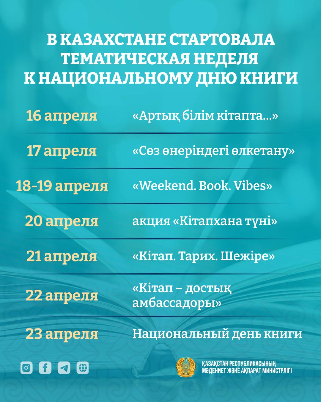 В рамках недели запланировано более 1500 мероприятий. Неделя включает следующие тематические дни: 16 апреля — "Артық білім кітапта...", 17 апреля — "Сөз өнеріндегі өлкетану", 18-19 апреля — Weekend. Book. Vibes, 20 апреля — акция "Кітапхана түні", 21 апреля — "Кітап. Тарих. Шежіре", 22 апреля — "Кітап – достық амбассадоры", 23 апреля — Национальный день книги.