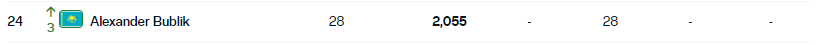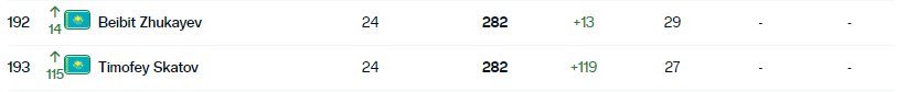 С таким же количеством баллов, но на один пункт выше, стоит Бейбит Жукаев. Лидеры мужской сборной Казахстана Александр Бублик и Александр Шевченко также поправили свое положение в свежем рейтинге.