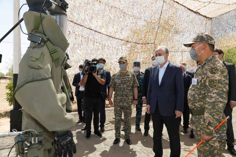 Президент ознакомился с вооружениями и специальной техникой воинской части. Токаев отметил важную роль этого полигона и воинской части в обеспечении национальной безопасности.