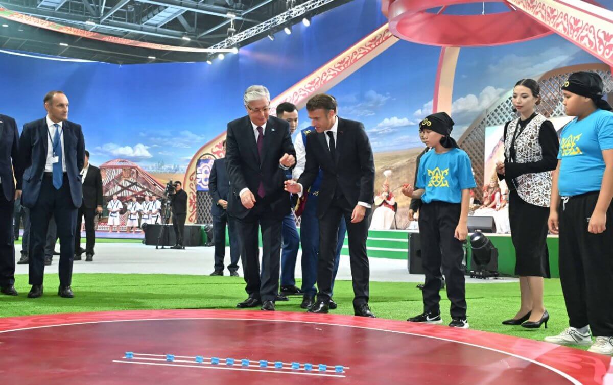 Также для высокопоставленных гостей организовали показательные выступления по национальной борьбе қазақ күресі и игре в асык ату. В последнем попробовали свои силы и главы государств. Президент Казахстана научил Макрона играть.