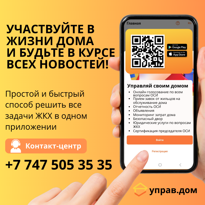 Приложение бесплатное. Подробная информация – на сайте https://www.upravdom.com.kz. Контакт-центр: +7-747-505-3535.