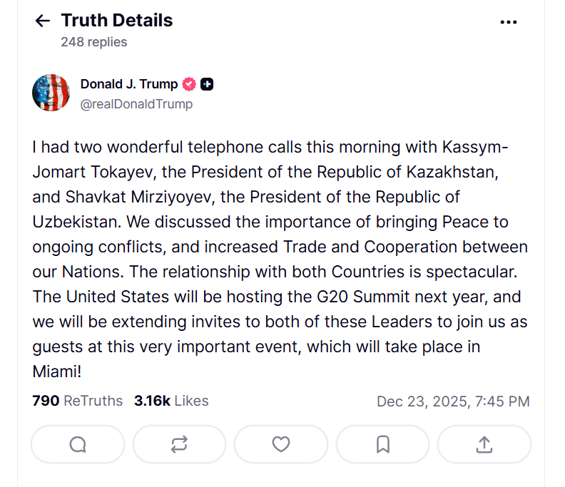 “Сегодня утром у меня состоялись два замечательных телефонных разговора с Касым-Жомартом Токаевым, президентом Республики Казахстан, и Шавкатом Мирзиёевым, президентом Республики Узбекистан. Мы обсудили важность установления мира в текущих конфликтах, а также расширение торговли и сотрудничества между нашими странами. Отношения с обеими странами впечатляющие. В следующем году Соединенные Штаты будут принимать саммит G20, и мы пригласим обоих лидеров присоединиться к нам в качестве гостей на этом очень важном мероприятии, которое пройдет в Майами”.
