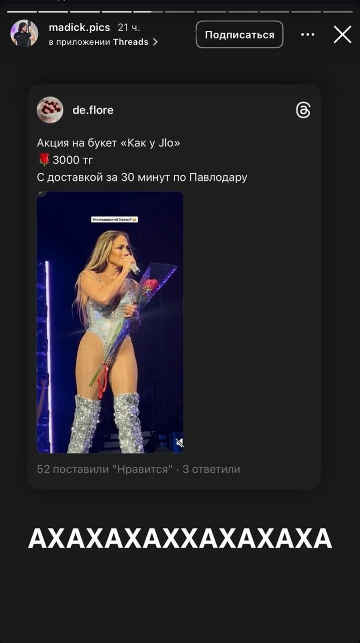 Цветочные магазины Павлодара не остались в стороне: они тут же запустили акцию “Букет как у J.Lo” — три красные розы за 3 000 тенге с доставкой за 30 минут.