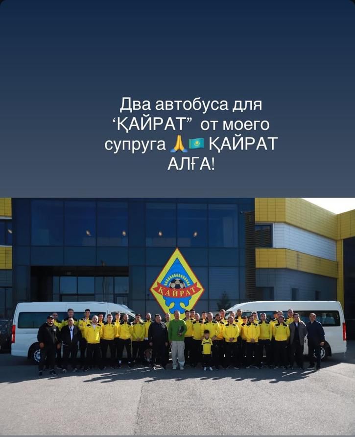 Продюсер и актриса Баян Алагузова сообщила в Instagram, что ее муж, бизнесмен Турсен Алагузов, подарил футбольному клубу “Кайрат” два новых микроавтобуса, передает Liter.kz.