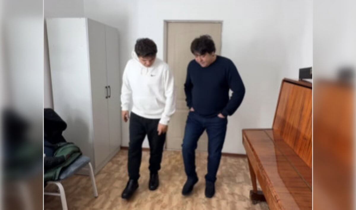 Солист снял участников группы “МузАРТ” Мейрамбека Беспаева и Кенжебека Турсынбайулы за попыткой разучить новый танец. Им нужно было исполнить проходку, остановиться и выполнить простые танцевальные движения.