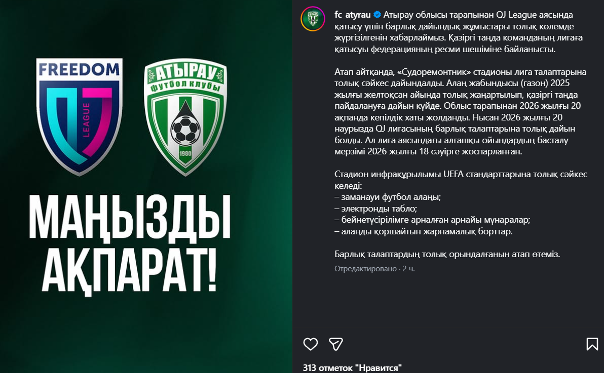 “Со стороны области 20 февраля 2026 года было направлено гарантийное письмо. Стадион полностью соответствует всем требованиям QJ League на 20 марта 2026 года”, – отметили в клубе.
