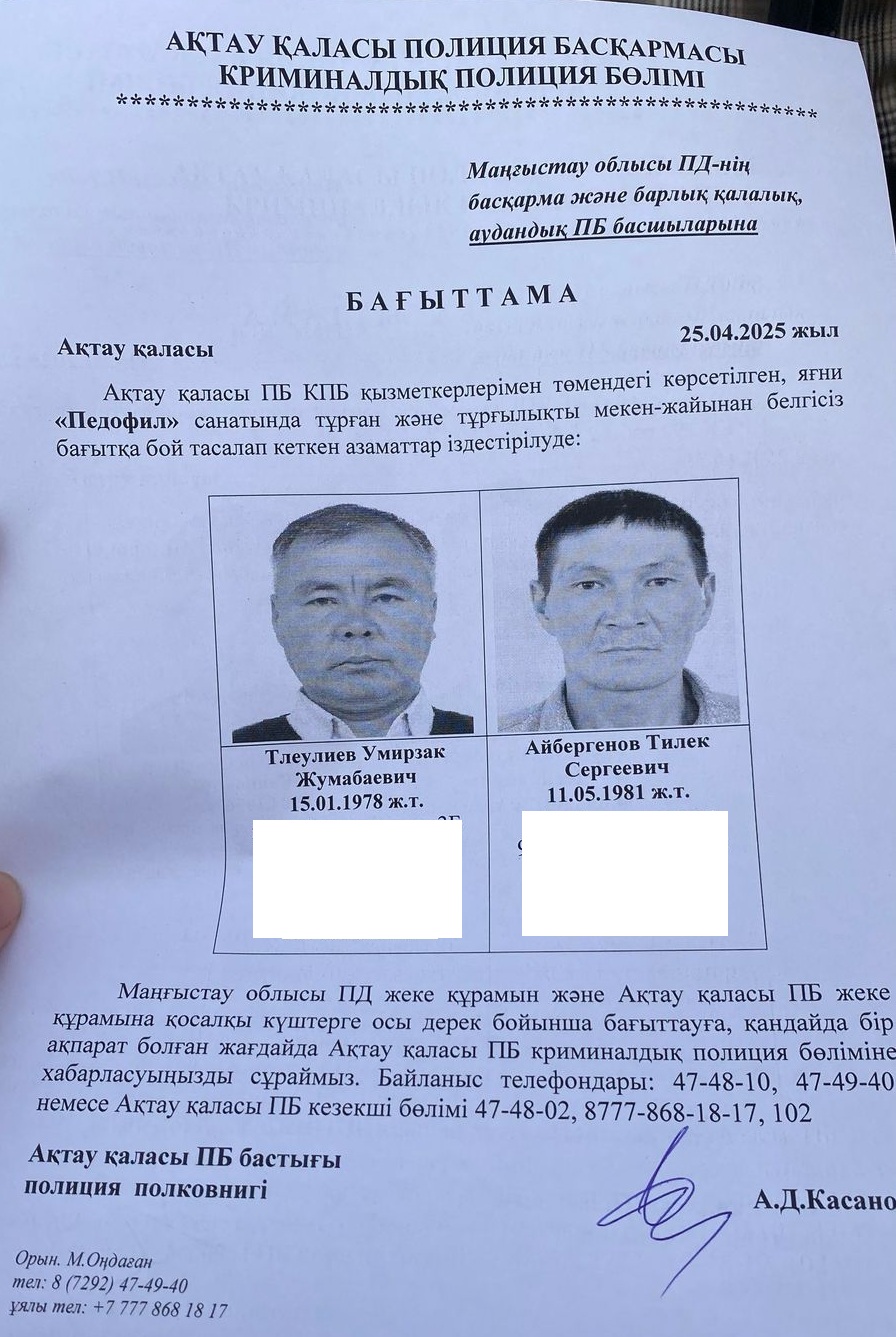 В Актау активно распространяется ориентировка на двух мужчин, подозреваемых в особо тяжких преступлениях против детей. Информацию о них местные жители пересылают друг другу через WhatsApp, передает Liter.kz со ссылкой на Lada kz.