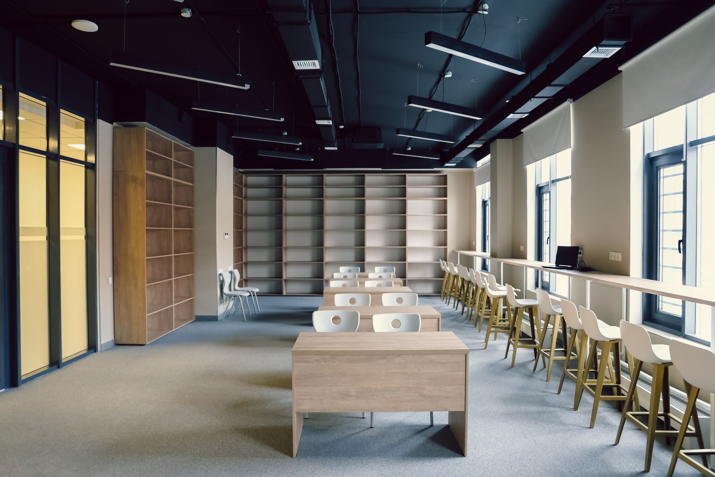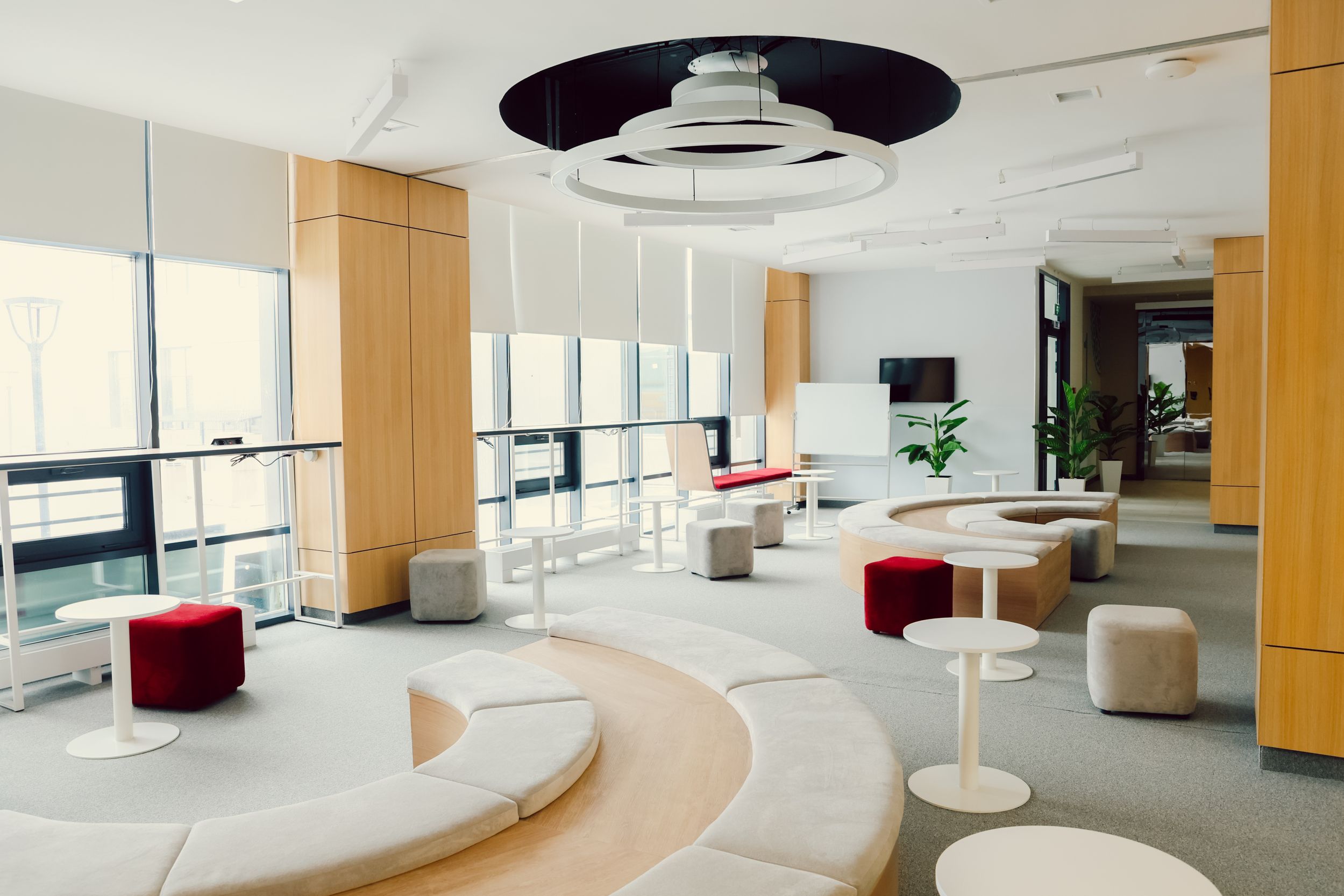 Здесь есть коворкинг, библиотека, актовый и кинозал, тренажерный зал, столовая, медицинский пункт и зоны ожидания для гостей.